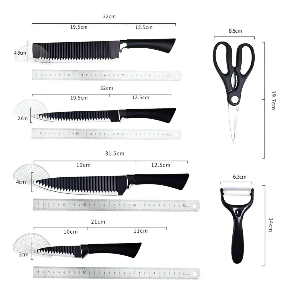 Este kit de facas conta com seis peças em revestimento antiaderente, lâminas super afiadas e design elegante na cor preta.O cabo ergonômico garante maior segurança no manuseio.Fabricadas em aço inox de alta durabilidade para cortes precisos.